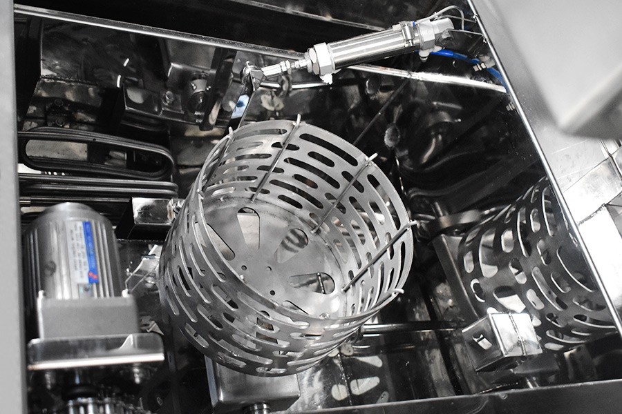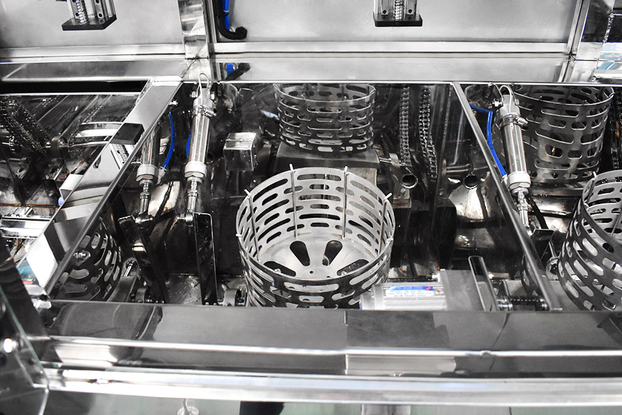 該設備有自動上下料及轉角系統、超聲波清洗系統,自動拋動、自動溢流和油污分離裝置,噴淋系統、自動高壓切水系統、自動烘干系統。機械手自動輸送系統采用高精度直線導軌配合高精度位置檢測傳感器,機械手可以準確的實現工件的抓取和放置。自動進排液和自動加溫系統完全實現了無人干預,自動運行,很大程度上降低了工人的勞動強度。先進的霧氣處理系統可以將清洗時產生的霧氣冷凝回流,空氣經過濾和活性炭吸附后排出。